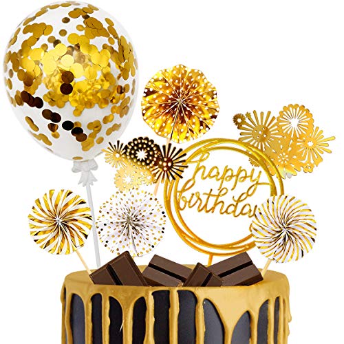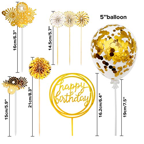 Golde Cake Topper: 1 * gouden confetti ballon, 1 * gelukkige verjaardag topper, 4 * papieren fan cake toppers, 2 * vuurwerk cake toppers. Past het beste op 6″-10″ taarten.