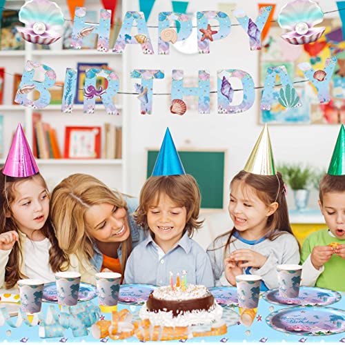 Seashell Design: Het tafelkleed van Mermaid Servies Set is ontworpen met visschubben, schelpen en parels, die glans aan uw verjaardagsfeestje zullen toevoegen en uw tafel vol romantiek zullen maken.