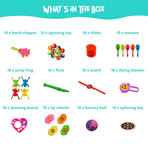 Variëteit: 10 van elk – handklappers, tollen, slinky trapveren, maracas, springkikkers, horloges, vliegende shooters, fluitjes, stuiterballen & tekenborden.