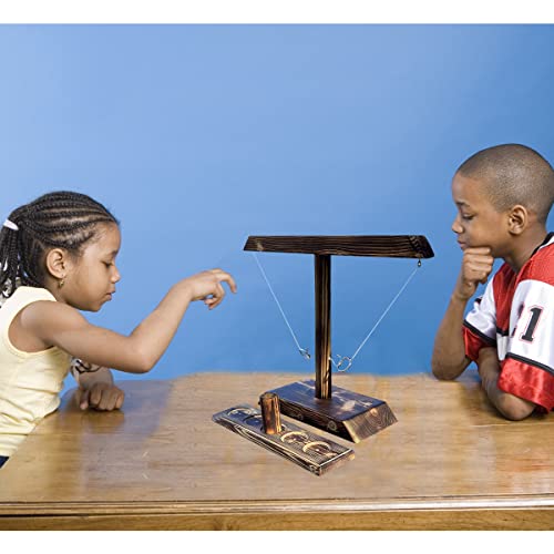 Speelregels: plaats de houten beker in het midden en beide partijen gooien afwisselend de stalen ring. Als hij op de haak wordt vastgehaakt, beweegt de houten beker een veld vooruit en de groep die eerst het einde bereikt wint.