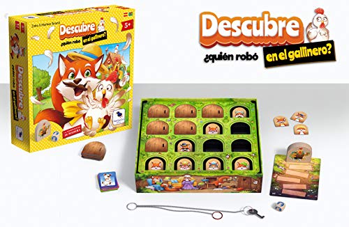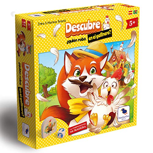Ontdek wie in het kippenhok is gestolen? “Hole me meteen terug aan mijn kippen! Kakareo Koki Bermejo. Nonchalant, ontvouwt zijn vleugels, maar dat lijkt niet de inbreker van kippen, die zich in zijn kust verborgen en onder zijn vrienden verbergt. Wie onder alle vossen was de baksteen? Helpt koki om dieven te verwijderen door de deuren van de insteekdeur met de sleutel te openen. Sommige dierenvrienden hebben de dief gezien en kunnen je sporen over hun uiterlijk geven; alleen zo kun je hem vastvangen. Ontdek je: wie heeft in het kippenhok gestolen, zul je in staat zijn om dieven van kippen te vangen? Bereid je goed op je laaglaag: je moet ze repareren om een van de deuren van de vossen met je vaardigheid en een sleutel te ontdekken. Probeer het juiste door de sleutel in het slot te steken en de deur op te tillen zonder dat hij eruit valt. Geloof je dat het gewoon is? Wachten dan want de speler van je linker zal de kubus voortdurend op de tafel gooien om je vervelend te maken. Elke keer als het symbool van de kraan verschijnt, beweegt de tijd en het koki-figuur op de weg. Als Koki aan het einde komt, is je laaglijn klaar, heb je de deur gecreëerd. Als je ze wilt openen, krijg je de vossips. Vossen zijn zeer slimme dieren en elke keer als je een deur krijgt, zul je in een van de volgende ronde vallen, moet je de test aan de deur plaatsen om de volgende te krijgen. Mogelijk moet je proberen een andere deur met een gesloten oog te openen, op het pootkussen, met je linkerhand (of rechtshandigen, linkshandigen) of met de bovenste ring te gebruiken, die de ketting dubbel zo lang is. Natuurlijk zal je buren de kubus verder onstoppen om te voorkomen dat de deur wordt geopend. Sommige kokidieren hebben de kippendief gezien, maar dat is bekleed. Gelukkig lukt bij alle dieren vrienden precies aan zijn uiterlijk te herinneren. De hond was al dan niet als snor of niet; de kat, als je een bril had gehad, het varken is aan je haar bevestigd, zodat je kunt zeggen of je een lus hebt gezien; de muis is aan de hoed bevestigd. Als de dieren hun dieren aan het einde van het spel opgeven, worden de vossen uitgesloten die de spelers hebben bereikt en niet aan de beschrijving voldaan: Is de kat zegt dat de vos geen bril heeft? Alle vossen worden met een bril verwijderd. Ten slotte zal er alleen een vos voor een speler staan, die winnaar is… Of kan het de vos gelukt zijn en iedereen verliezen het spel… Levering: 1 speelbord • 1 ketting met sleutel • 1 kubus • 1 koki-figuur van hout • 16 deuren • 16 vossen • 1 weg • 8 titelkaarten • 1 verordening (Spaans/Portugees). Ontdek je wie in het kippenhok heeft gestolen? Dit is een fluitje van de gerenommeerde autoriteiten Inka en Markus Brand. Denk aan de klassieke spellen om een figuur te ontdekken, maar aan de kleinsten worden aangepast, door dezelfde behendigheid, spanning, afvoer en geluk te mengen. Een leuk cadeau voor het hele gezin. Hij onderscheidt zich door zijn uitstekende houten componenten, ideaal voor gebruik bij kinderen vanaf 5 jaar en illustraties die kinderen zoals kippen op de vossen trekken.